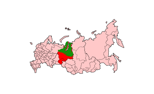 緑の部分がロシア連邦中部チュメニ州の属するハンティ・マンシ自治管区