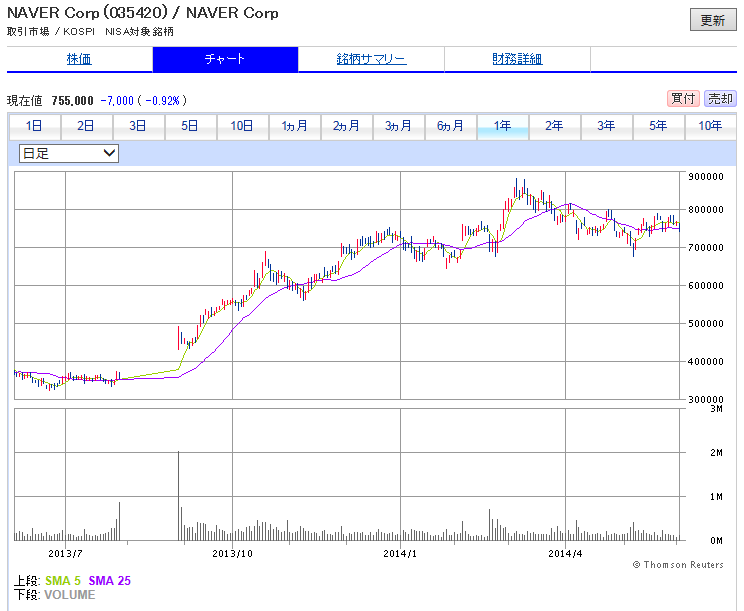 ↓ラインの親会社 NAVERの株価 (韓国株)
