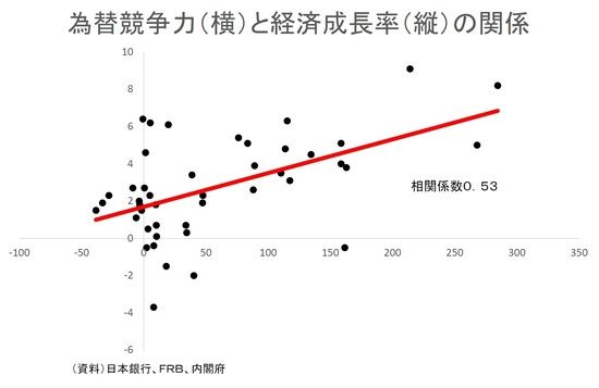 ソロスチャートにおいて、実際に為替レートと均衡値の差の均衡値に対する割合を為替の割安(高)による競争力とみると、日本経済の成長率と関係がある。