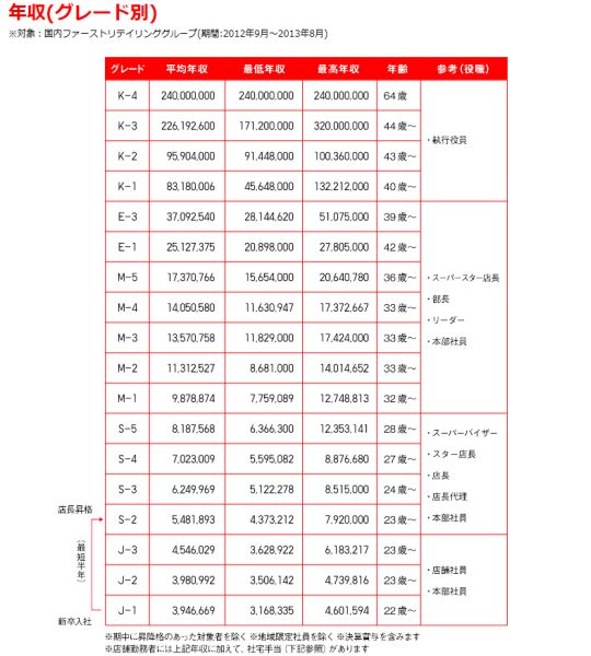 ファーストリテイリングが採用広告の一環として、社員グレード別の年収をすべて公開した。40代執行役員で3億円以上、30代のスーパースター店長の最高で年収5000万円以上も可能。一方で最低は新卒入社の社員で300万円台前半だった。