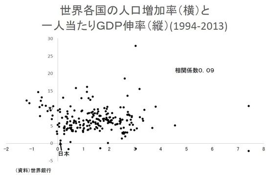 日本で人気のある「人口減少が経済成長を妨げている」という説は、世界を見る限りまったく説得力がない。下のグラフが示すように、人口減少でも成長している国は多いし、一人当たりGDPの成長率は人口増減率と相関はないのである。