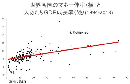 両者は相関関係になっている。相関係数0.5という数字は決して強い相関とはいえないが、こうした関係は他にまずないから、経済成長を説明しうるものだ。もちろん、相関関係は因果関係を意味していないが、各国のデータを個別に調べると、マネー伸び率は1~2年程度のラグで、経済成長に影響していることがわかる。
