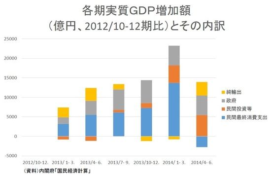 今年1-3月の民間消費と民間投資が2013年10-12月期並であったとしてみよう。その場合、2013年1-3月期から2014年1-3月期までの5四半期で実質GDPは15.4兆円増加している。そのうち、民間経済(民間消費、民間投資等、純輸出)はその65%を占め、残り35%は政府支出になっている。これは、金融政策は民間経済に効くわけなので、その効果が10兆円増となって、財政政策の効果が5兆円程度であると考えることができる。