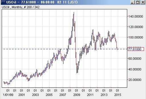 普通ここまで急落するとサウジが生産調整して値を持ち直すんだが、シェールガス(採算ラインが原油バレル80ドルと同等)に打撃与えるために増産体制のまま、という記事が出てたな。