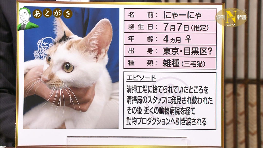 田勢氏は「(まーごの)後任を探そうと、たくさんのネコとお見合いした。この生い立ちを聞いた時、このネコ以外にない」と抜テキの経緯を説明。繁田美貴アナウンサー(30)は「これからよろしくね」と笑顔であやしていた。田勢氏が生放送中のスタジオ内にネコを常時、歩かせる演出を提案。これを条件に出演を引き受けた。