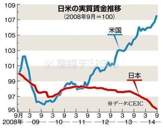 日本経済は20年以上停滞していたけれども、アベノミクス以降は事態がさらに悪くなっている。アベノミクスがもたらしたのは、本物の景気後退と、スタグフレーションへの懸念の高まりだ、と氏は語る。日本の貿易収支は改善せず、国内販売が中心の中小企業は売上不振に直面している。物価上昇によって、ケインジアンが予想したようには、実質賃金は上がってはいない。アベノミクス以前よりも購買力は下がっている、と氏は指摘する。