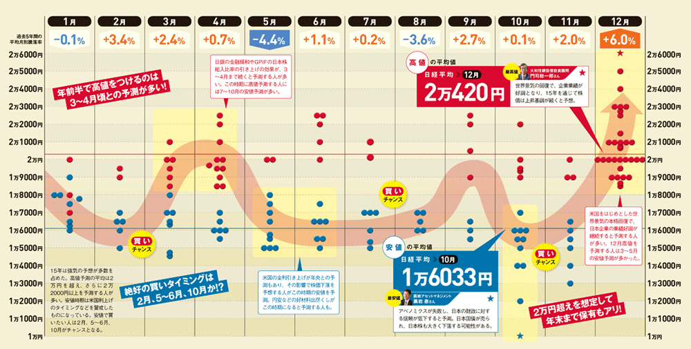 加えて、日本や欧州の追加の金融緩和など、株が買われやすい環境になりつつある。大和住銀投信投資顧問の門司総一郎さんは「日銀のETF購入やGPIFの日本株組み入れ比率の引き上げで15年末に高値2万6000円」と最も強気。さらに、懸念の個人消費も「春闘の賃上げで消費も低迷から脱出し、NISAを中心に個人投資家の買いも増加する」(金融ストラテジスト春山昇華さん)可能性もある。