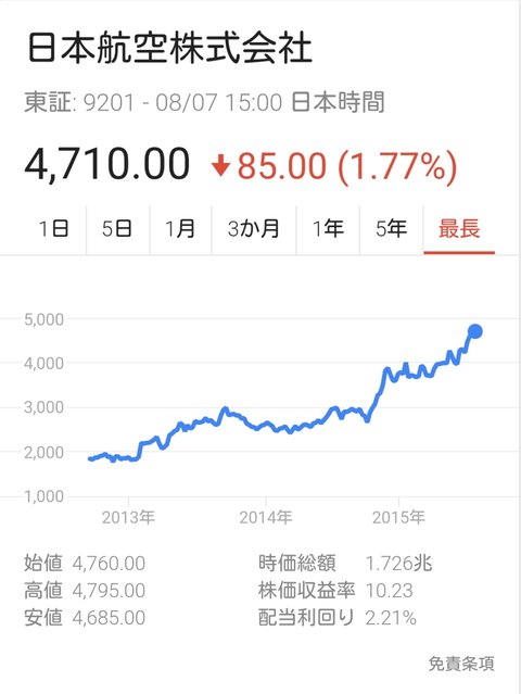 JAL,震災後の東京電力当たりはグラフ見ても分かる通り中期的には右肩上がりなのよ。こういうのを10社ほど買うと万が一のリスクで急に倒産して株が紙屑になっても他のやつでカバーすることで半年後にはチャラになる