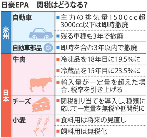 日豪EPAで最大の焦点だった日本の牛肉関税は15日以降、冷蔵が38.5%から32.5%に、冷凍が30.5%にそれぞれ下がる。その後も段階的に引き下げられ、冷蔵は15年目に23.5%、冷凍は18年目に19.5%となる。ワインは15%か1リットルあたり125円の安い方を選ぶ現行関税が7年かけて撤廃される。