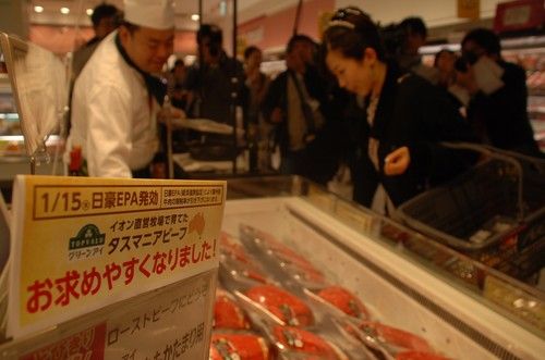 日本とオーストラリアの経済連携協定(EPA)が15日午前0時、発効した。豪州からの輸入牛肉にかかる関税の引き下げなどが柱だ。国内の一部小売店では、豪州産牛肉の特売を始めるなど発効を受けた動きが早くも活発化している。一方、豪州向けの自動車関税なども撤廃され、日本の輸出拡大に期待がかかる。
