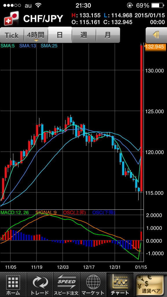 後のスイスフランに買い注文だしてたやつは爆死どころか普通にぼーっとスイスフランで資産持ってたやつですら一晩で資産1/3くらい消えたという意味不明さ