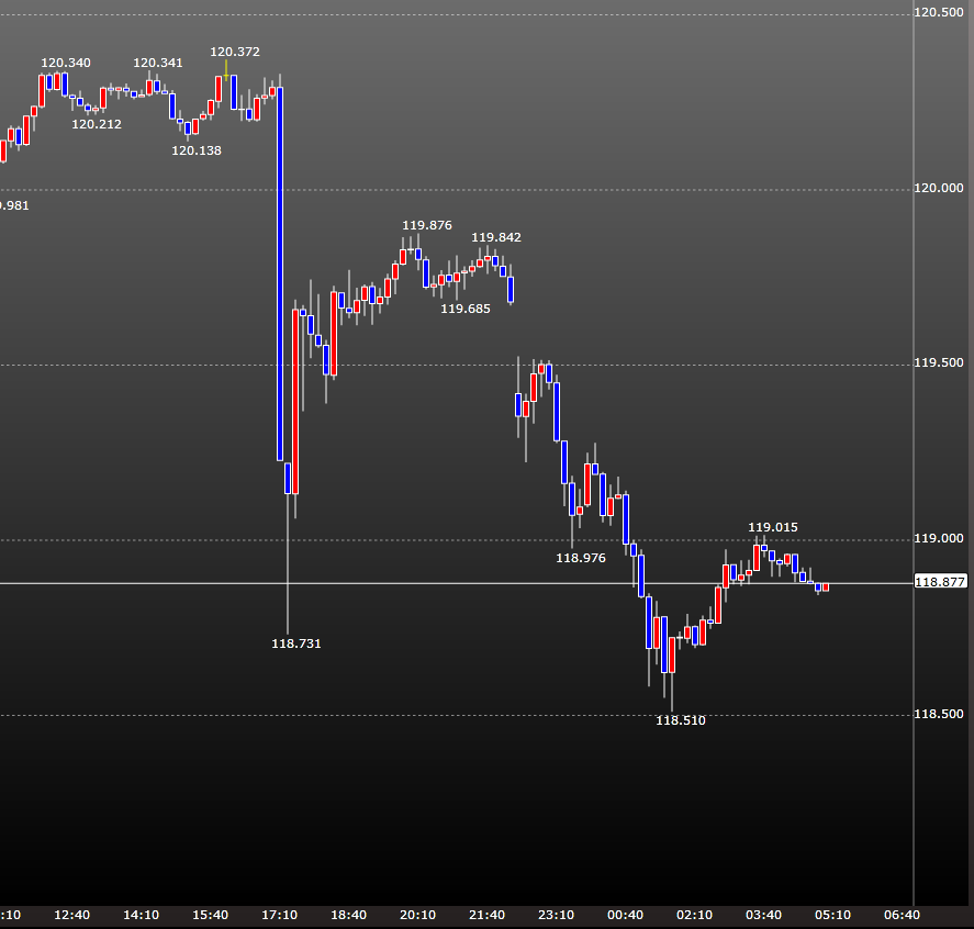 【DailyFXJapan】ドル円は先程の「関係者」談話を受け120.30→118.73まで一瞬にして1円50銭近く急落。