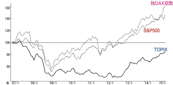 図表2:日・独・米の株価指数(07年1月を100として指数化)