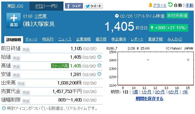 内紛中の大塚家具の株価がストップ高!材料は配当増?仕手株化?