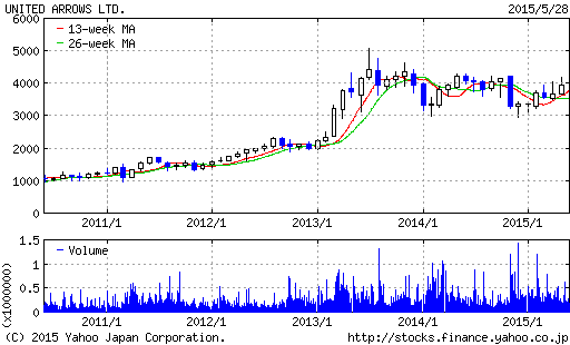 5月8日に発表した2014年度の連結業績は、営業利益が前期比16.8%減の113億円。期初時点では最高益を見込んでいたが、一転して、6年ぶりの減益に落ち込んだ。高額宝飾ブランド品の「クロムハーツ」は好調に推移したが、主力のセレクトショップ「ユナイテッドアローズ」が不振だった。