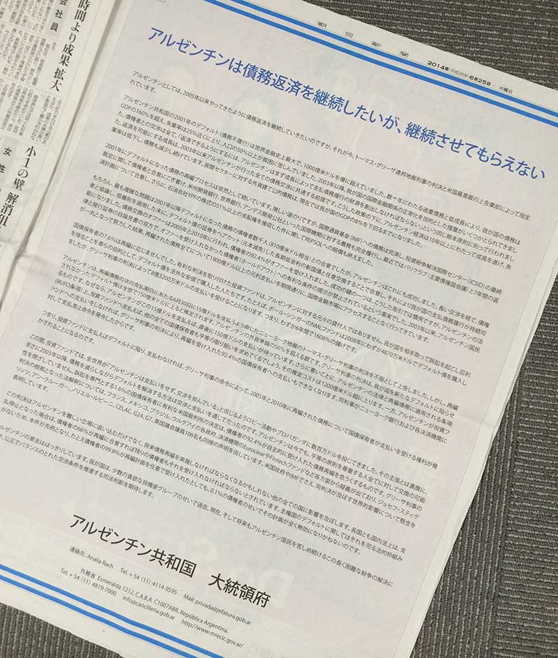 朝日新聞の6月25日付け朝刊に、「アルゼンチン共和国 大統領府」による全面広告が掲載された。「アルゼンチンは債務返済を継続したいが、継続させてもらえない」と題して、最近の米連邦地裁の判決が同国を再びデフォルト(債務不履行)に追い込むとして抗議する内容だが、珍しい全面広告だけにTwitterなどで話題になった。