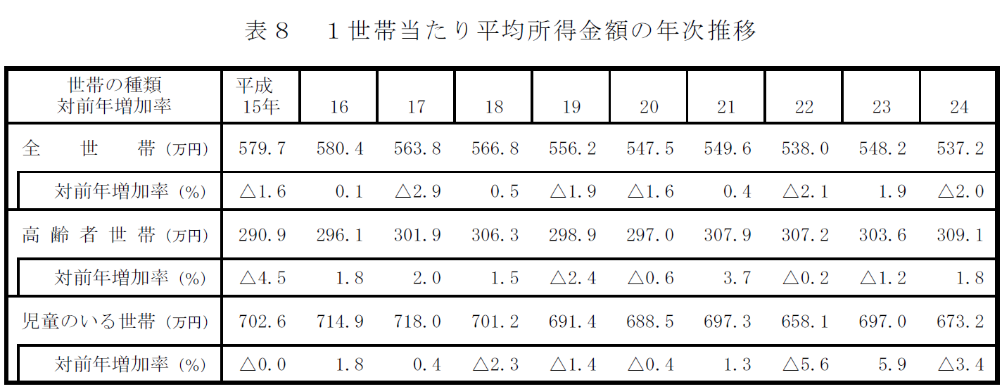 2012年の1世帯当たり平均所得は537万2000円で前年比2.0%減少した。1988年の545万3000円を下回り、データが残る85年以降で過去4番目の低さとなった。同省は「背景として、非正規雇用の増加といった就業形態の変化があるのではないか」と分析している。
