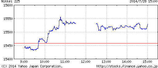 日経平均株価(225種)の終値は、前週末比71円53銭高の1万5529円40銭と、1月23日以来、約半年ぶりに1万5500円台を回復した。
