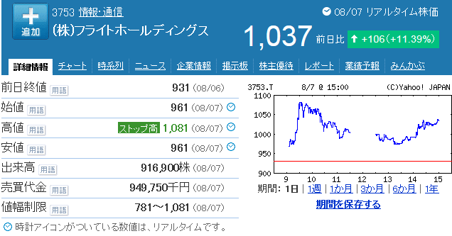 フライトHDストップ高キタ━━(゚∀゚)━━!!と思ったら残念系決算でPTS株価だだ下がり。