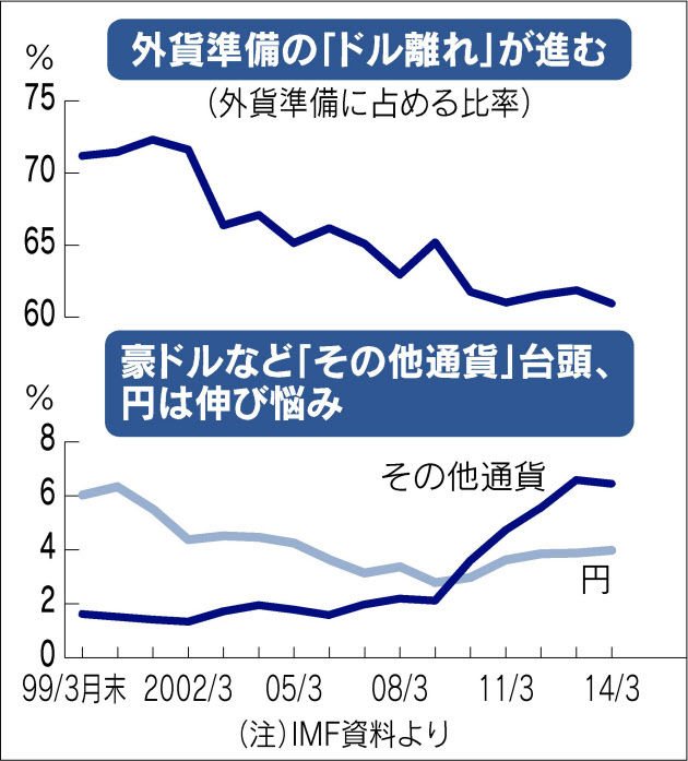 世界の外貨準備、ドル比率が過去最低の60%まで減少。豪ドルや人民元人気高まる。