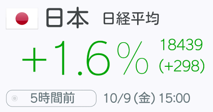 9日後場の日経平均株価は前日比297円50銭高の1万8438円67銭と大幅反発し、高値引け。終値での1万8400円台回復は9月17日(1万8432円27銭)以来。海外株高を背景にした前場の好地合いを引き継ぐ形で、後場寄り付きから買いが先行した。