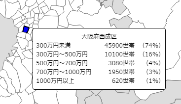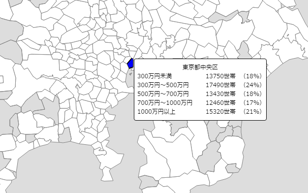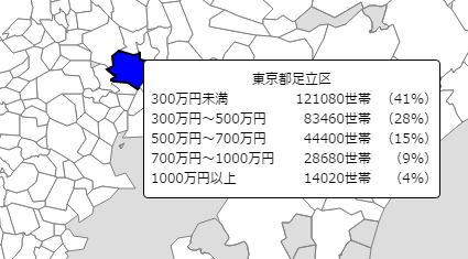 総務省統計局が公開している平成25年住宅・土地統計調査の中には「世帯の年間収入階級(5区分)」というデータがあり、「300万円未満、300万円-500万円、500万円-700万円、700万円-1000万円、1000万円以上」の世帯がどのくらいあるかが調査されているのですが、そのデータを地図上にマッピングしたのが「世帯の年間収入マップ」です。「年収1000万円以上の世帯が5%を超える地域」など指定することで、どの地域にどういう年収の世帯が多いのかが一目でわかるようになっています。