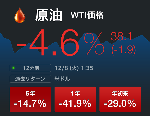 12月4日の22時30分の、41.6→40への原油の暴落は、「雇用統計」も有りましたが、三ヶ月に一度開催される、「OPEC」の総会が有って、そこで「減産をしない」という決意が下されたからですよ。