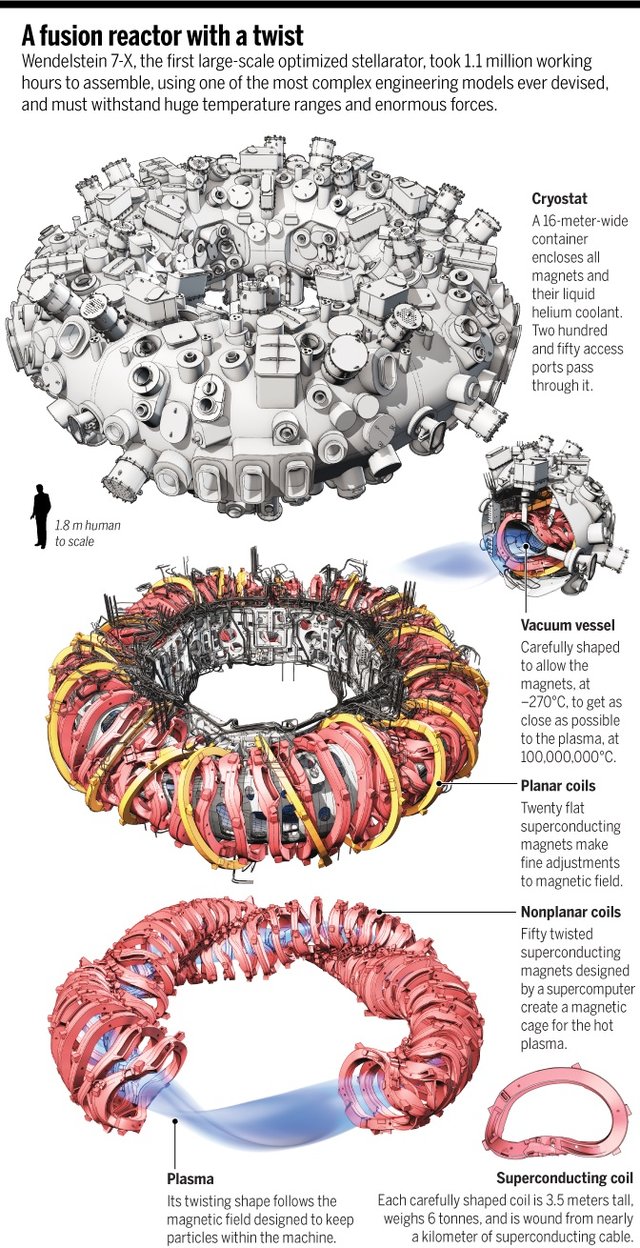 その見た目は「Science」によるとこんな感じ。上段の灰色のモノは最も外側の極低温冷却装置を示しています。中段は冷却装置の内側の図で、黄色は平らな超伝導電磁石、赤色は非平面の超伝導電磁石。円を描くように並べられていますが、同時に非平面の電磁石は同じ形のものを並べているのではなく螺旋のようにねじりながら配置されています。下段は電磁石と、その中に生まれたプラズマ(青色)が示されています。