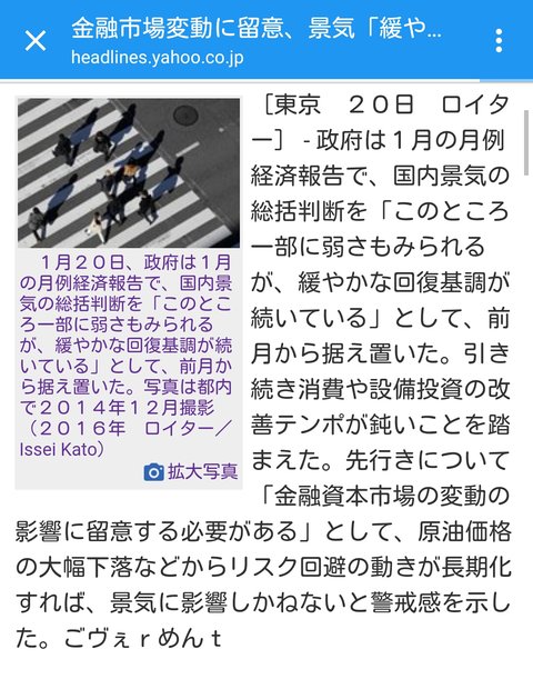 引き続き消費や設備投資の改善テンポが鈍いことを踏まえた。先行きについて「金融資本市場の変動の影響に留意する必要がある」として、原油価格の大幅下落などからリスク回避の動きが長期化すれば、景気に影響しかねないと警戒感を示した。ごヴぇrめんt