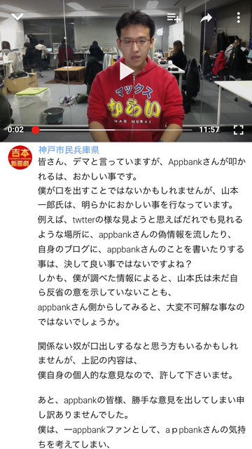 やまもといちろうは、1本目の動画の後に、村井からもAppBankからも別に要望要求など無かったのに「AppBankの要望により」としてブログ記事の断定的な表現をすべて曖昧な表現に変更済み