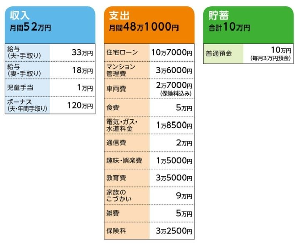 では、家計のやりくりでもっと貯蓄ペースを上げることはできるでしょうか。まず、世帯収入が月額52万円、対して支出が44万6000円。これに貯蓄分3万円を差し引いても、4万4000円の行き先が不明となっています。これは、年間では53万円にもなります。貯蓄が増えていないのですから、実際何に支出しているかを把握しておくべきです。