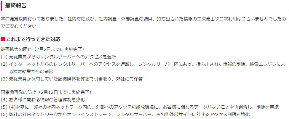 >持ち出しの事実以外に、外部へ漏えいしていない事を確認いたしました
