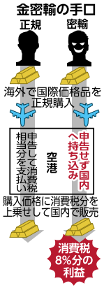 だが密輸して日本国内で売却すれば8%が上乗せされ、売り手が消費税分の利益を得ることができる。暴力団組織が国内で販売し、利ざや分を資金源としている可能性がある。捜査関係者によると、金は覚醒剤などと違い、輸入行為自体は禁じられていない。