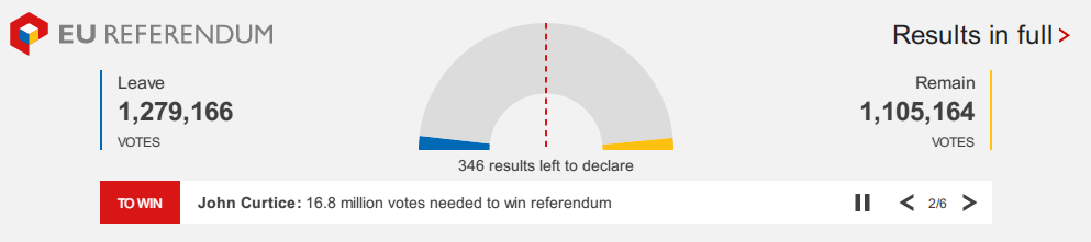 選挙速報 英国EU離脱派が優位