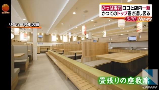 「かっぱ寿司」といえば、おなじみのカッパのマークでしたが、新たなロゴはたくさん食べる楽しさをイメージして皿を重ねたデザインになっています。店内も、これまではテーブル席が中心でしたが、子連れ客がくつろぎやすいように畳張りの座敷席を設けました。
