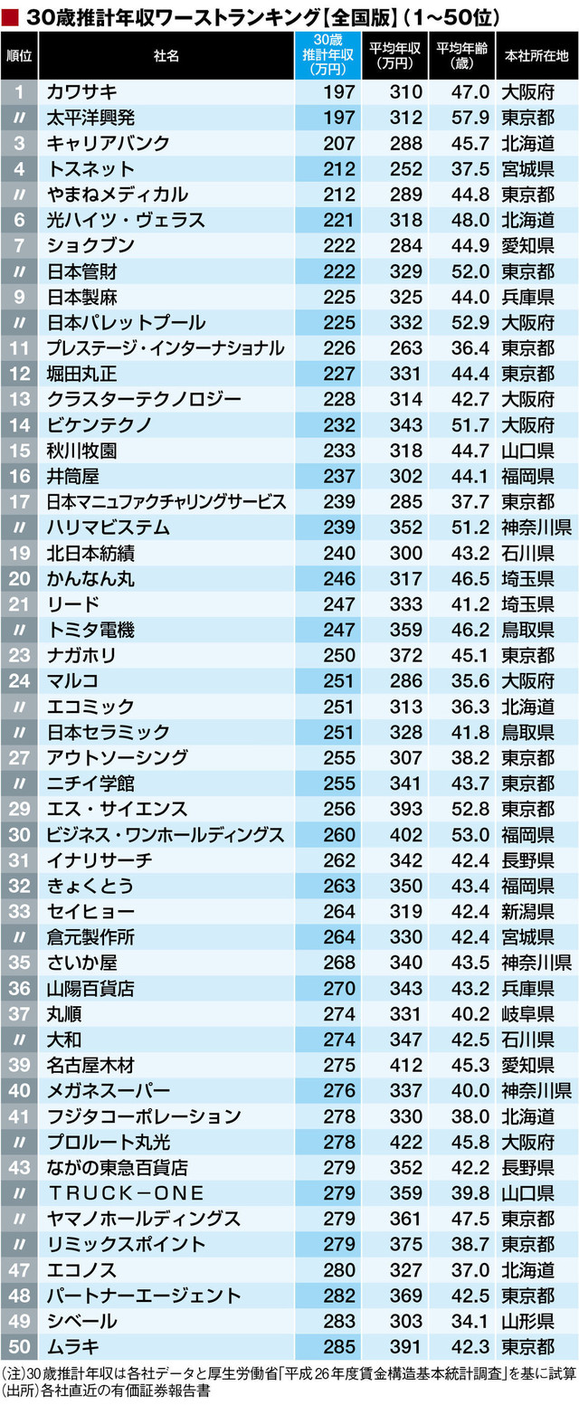 これまで「東京都トップ500社」「東京都ワースト500社」「近畿583社」「中部431社」「東京除く関東323社」「地方に本社置く297社」「全国トップ500社」の30歳年収ランキングを紹介してきたが、最後に全国ワースト500社のランキングを公開する。