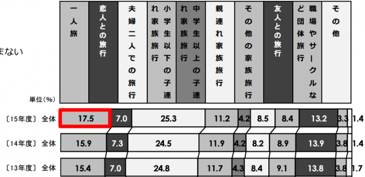 「ふらっと一人旅に出る機会を常に狙っている」という人が意外に多いのではないだろうか。じゃらんリサーチセンターの「宿泊旅行調査」によると、一人旅は調査開始以来毎年増加し、現在では旅行件数の17.5%を占めている。10年前と比べるとその増加は162%と、他の旅行形態に比べて圧倒的な増加率だ。