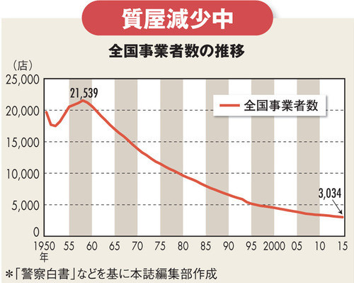 図が示すように、全国の質屋の数は1958年の2万1539店をピークに、見事に右肩下がりだ。