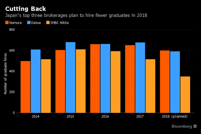 野村、大和証券グループ本社、SMBC日興証券の2018年4月入社の大卒採用予定人数は合計1542人と、今年4月入社の1847人から約2割程度減少する見通しだ。ブルームバーグ・ニュースが、預り資産規模で上位5社に取材した。