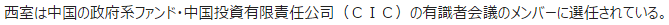 >西室は中国の政府系ファンド・中国投資有限責任公司(CIC)の有識者会議のメンバーに選任されている。