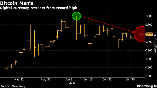 ビットコインは今年、採用拡大や機関投資家がブロックチェーン技術を一段と支持していることなどを背景に、価格が2倍強に上昇し一時は3000ドルを付けたが、5日には一時2544.40ドルに下げた。