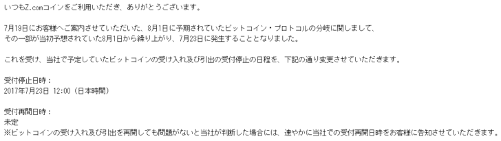 多数のビットコイン取引所が分裂問題の影響で急遽入出金を一時停止。25日に再開らしいが怖えな。