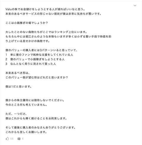 ヒカルが「ワイのvalu買っておけば儲かるやで」ってツイッターでつぶやいたけど、自分が美味しくなったところでやめて買ってくれた人達を全員見放したんや
