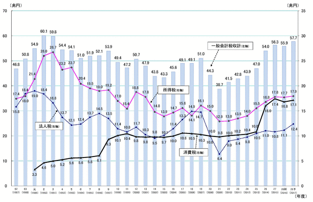 消費税が景気の浮き沈みにほとんど影響されない安定税収だと分かる。