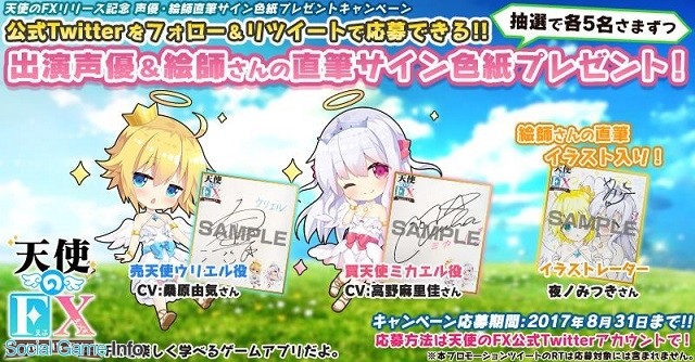 なお、リリースを記念して、Twitter で「天使の FX」キャンペーンをリツイートした人の中から抽選で15名に、桑原由気さん、高野麻里佳さん、夜ノみつきさんいずれかのサイン入り特別色紙をプレゼントする。こちらは8月31日まで受け付ける。