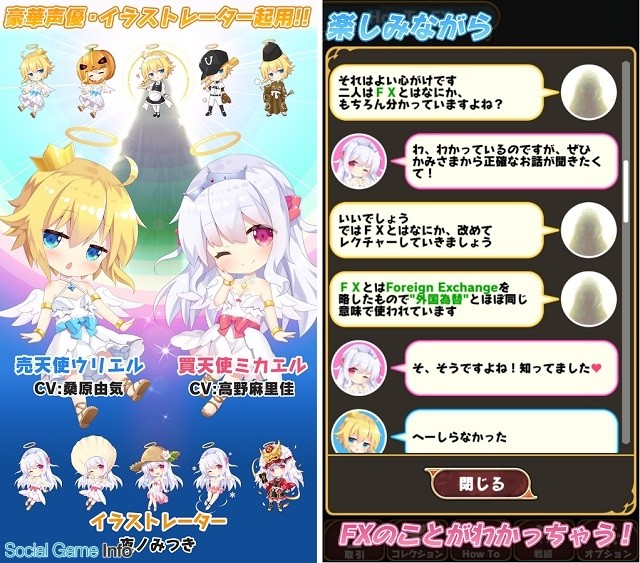 本作は、天界の FX 部署で働く2人の可愛らしい天使、ウリエル(CV:桑原由気さん) とミカエル(CV:高野麻里佳さん) に見初められたプレイヤーが、彼女たちとともにFXへ取り組むという、シンプルでテンポの良いゲームアプリとなっている。