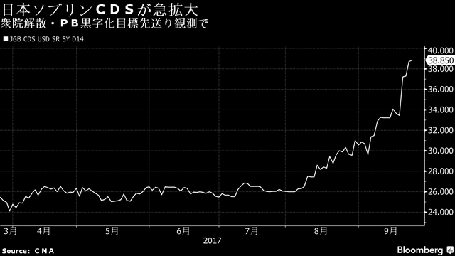 安倍晋三首相が解散・総選挙に踏み切るのを受けて、日本国債の保証コストが急上昇している。争点である消費税増税分の使途変更に伴い、基礎的財政収支(プライマリーバランス、PB)の黒字化達成が政府目標より遅れる可能性が高まり、国債格下げを予想する見方が出ている。