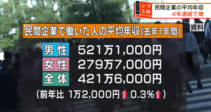 国税庁が最新の平均年収を公開してくれたぞ。前年比0.3%アップして平均年収は421万円(男521万円 女279万円)だ!