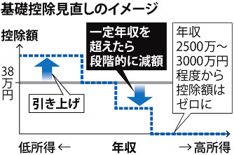 政府・与党はサラリーマンらに適用される給与所得控除を高所得者を中心に縮小する一方、低所得者などの基礎控除を引き上げる案も検討中。給与所得控除は自営業や請負契約で働く人は受けられないので働き方の多様化に対応する。給与所得控除と基礎控除の縮小で高所得者は増税が重なるがそれで得られた財源を基礎控除引き上げに充てる。