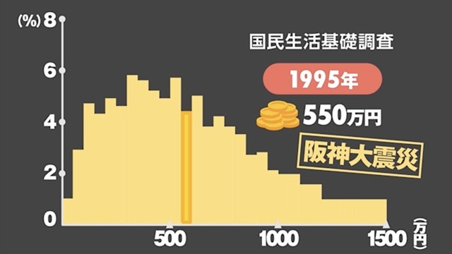 1995年に年収の中央値は550万円に上がってピークをつけました